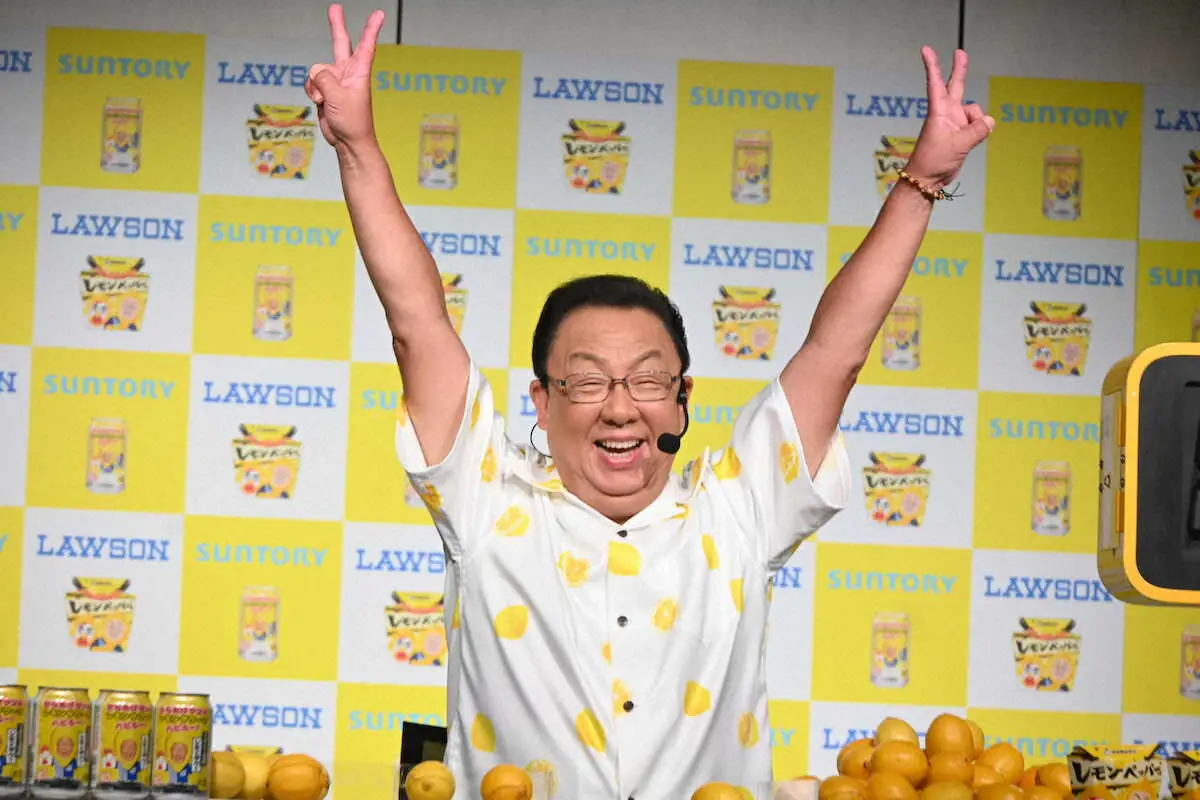 夏らしさ満載のレモン柄衣装で登場した梅沢。ローソン新商品を「この方がお持ちくださいます」とMCから声かけがあると、「え、にこるん?」とニヤケ顔。