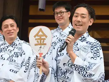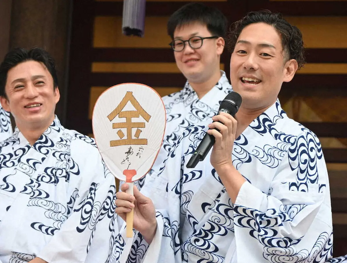 そんな勘九郎が持つうちわには「金」の文字。五輪にちなんだものかと思いきや「“きん”ではなく“かね”です。私の役は3部全てに金(かね)にまつわるセリフがございますので」と説明し、役どころをPRした。