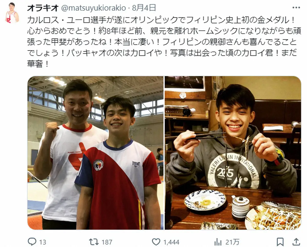 オラキオは「カルロス・ユーロ選手が遂にオリンピックでフィリピン史上初の金メダル!心からおめでとう!」とつづり、徳洲会に加入し日本を拠点に練習していた、体操男子フィリピン代表のカルロス・ユーロとの2ショットをアップ。体操の種目別床運動で、フィリピン男子初の金メダルを獲得したことを喜んだ。
