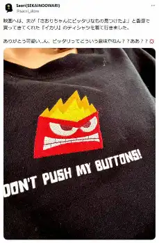 続く投稿で「映画へは、夫が『さおりちゃんにピッタリなもの見つけたよ』と香港で買ってきてくれた“イカリ”のティシャツを着て行きました」と伝え、映画に登場する怒りの感情を擬人化したキャラクターがデザインされたTシャツの写真を公開した。