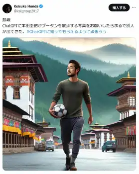 この日は「悲報」と題し、「ChatGPTに本田圭佑がブータンを散歩する写真をお願いしたらまるで別人が出てきた」と投稿。AIが生成した画像を公開し、「ChatGPTに知ってもらえるように頑張ろう」とつづった。