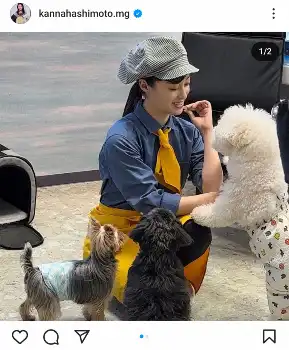この日はスキマバイトアプリ「タイミー」のCM撮影とし「もっとバイトしタイミー!」とつづり、ブルーのシャツに黄色のスカーフ、帽子姿の制服を着てポーズを取る橋本や、モフモフな犬たちとたわむれる姿を披露した。