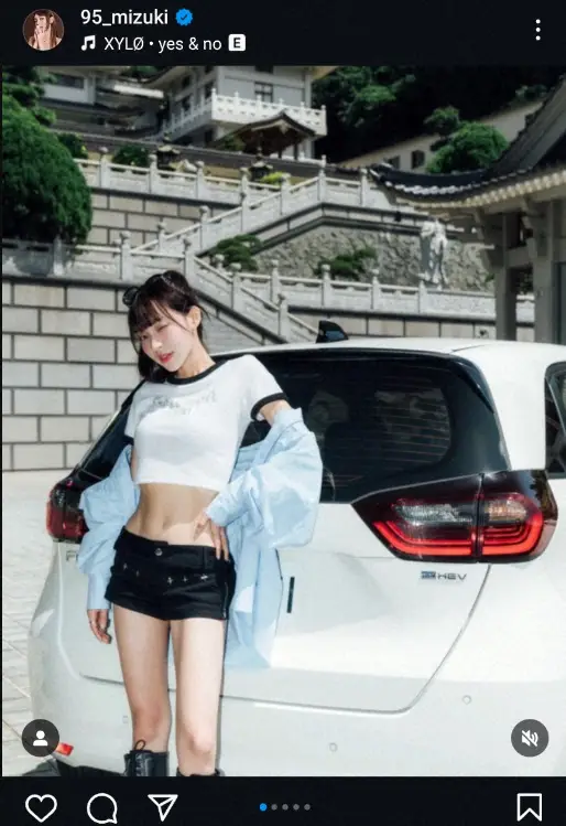 ホンダ「フィット・ハイブリッド」の前で、白のショート丈のTシャツに黒のショートパンツ姿で、ウエストに手を置いてウインクしているショットなどをアップした。