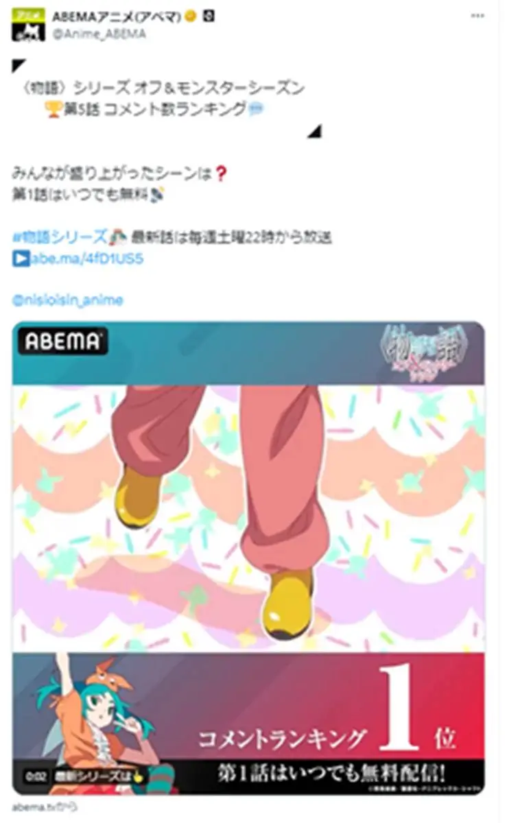 最新作『〈物語〉シリーズ オフ&モンスターシーズン』は7月よりABEMAで無料・独占配信されており、主題歌はYOASOBIの「UNDEAD」が話題となっている。次回の第6話は10日午後10時から配信される。