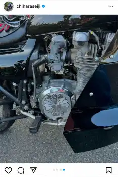 せいじが投稿したのは、黒いカワサキ(KAWASAKI)制のバイクと、車体の横のポイントカバーに「天台宗 靖賢」と刻まれた模様。「トゥーカッター天台宗仕様」「千原せいじ」「千原靖賢」「天台宗」と記した。