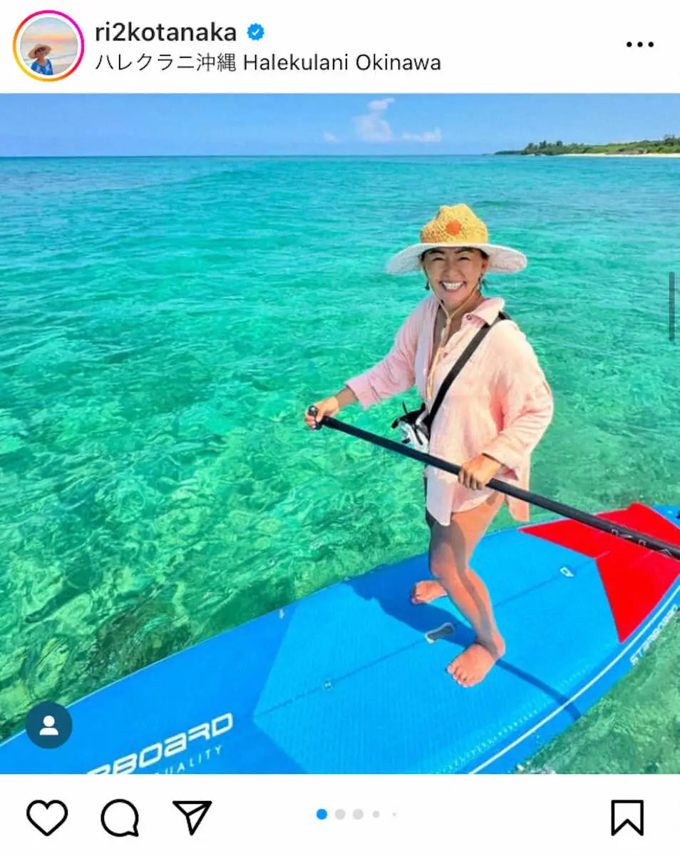 サップヨガとは、サーフボードより大きく浮力の高いスタンドアップパドルボートの上で、水の上に浮かんで行うヨガのこと。田中は自宅でのヨガに加え、海の上でのサップヨガもしている。