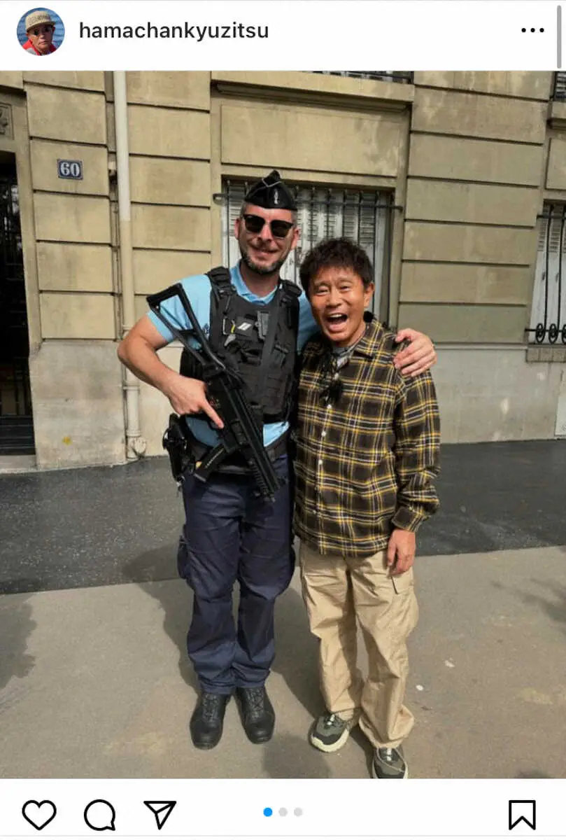 五輪では、バレーボールや柔道混合団体などの試合を観戦していた浜田。テレビ中継にもその姿が抜かれて話題となっていた。この日は「浜田雅功の旅日記」インスタグラムが更新され、いかつい銃を抱えた現地の警備担当と思われる人物と肩を組む衝撃の写真も投稿された。