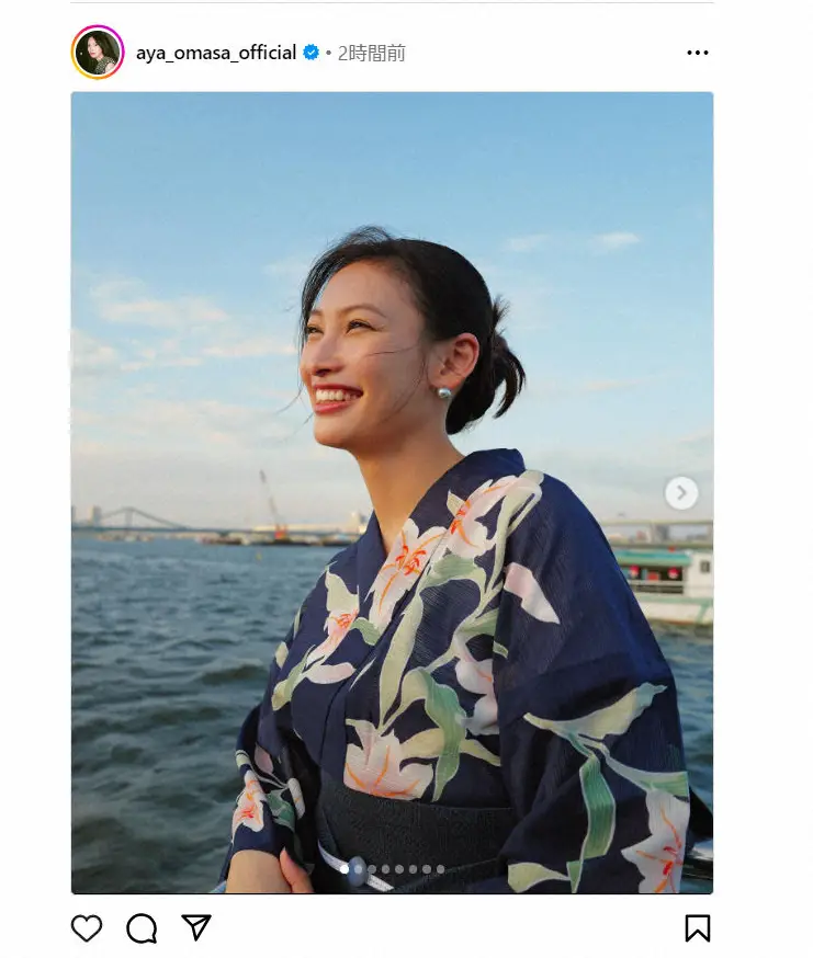 大政は「プライベートで久しぶりに浴衣を着て 間近で花火を堪能することができました」とつづり、紺色を基調とした浴衣姿の写真を投稿。