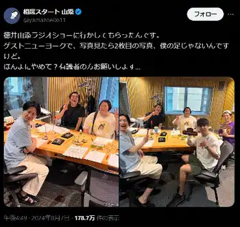 番組冒頭、塙宣之は「先週、代打MCだった山添くんの足下が心霊写真になったっていうのでニュースになった」と切り出し、7日放送の同局「平成ノブシコブシ・徳井&相席スタート・山添 ザ・ラジオショー」に出演した山添の公式X投稿に触れた。