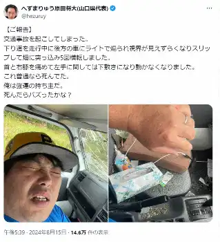 へずまは「交通事故を起こしてしまった」とし「下り道を走行中に後方の車にライトで煽られ視界が見えずらくなりスリップして畑に突っ込み5回横転しました」と事故の経緯を記すとともに、車内で顔をしかめ、フロントガラスが割れているのが写ったショットなどを投稿した。