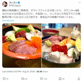 フィフィ公式X(@FIFI_Egypt)から フィフィ 横浜市の寿司店の海鮮丼コスパを“絶賛”、2月には築地の1万8000… ギャラリーで見る この記事のフォト 2024年08月16日の画像一覧 もっと見る 2024年08月16日の画像をもっと見る