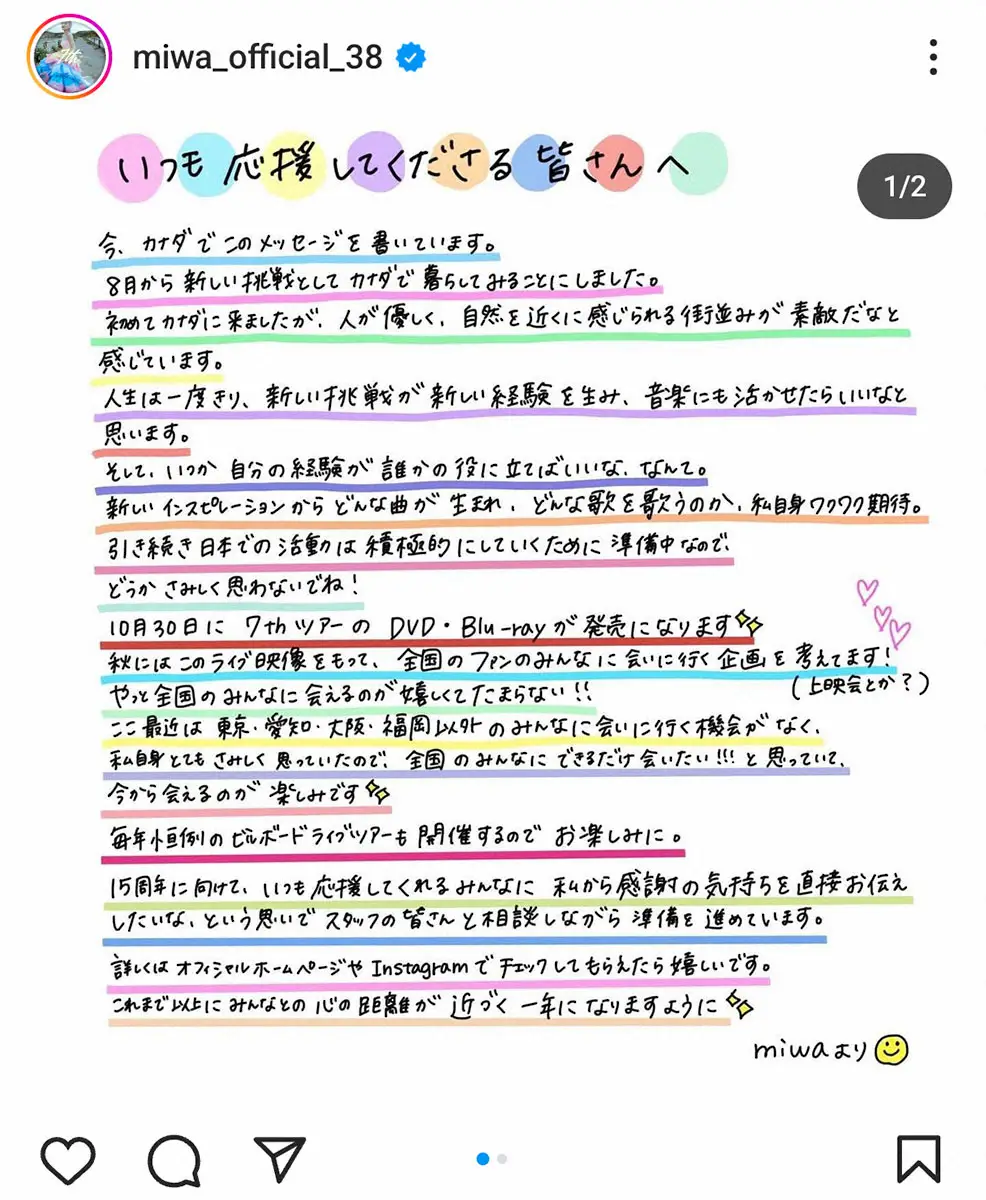 シンガーソングライターのmiwa(2017年撮影) Photo by スポニチ miwa カナダ移住を報告 音楽活動は継続「新しい挑戦が新しい経験を生み… ギャラリーで見る この記事のフォト 2024年08月16日の画像一覧 もっと見る 2024年08月16日の画像をもっと見る