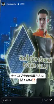 そしてストーリーズでは、街で掲出されているタイの首都圏配電公社(MEA)の広告の写真を公開。お笑いコンビ「チョコレートプラネット」の松尾駿そっくりの男性キャラクターが、太陽光パネルを手にキリッとしたポーズを決めているビジュアルに、「チョコプラの松尾さんに似てない!?」と驚いていた。