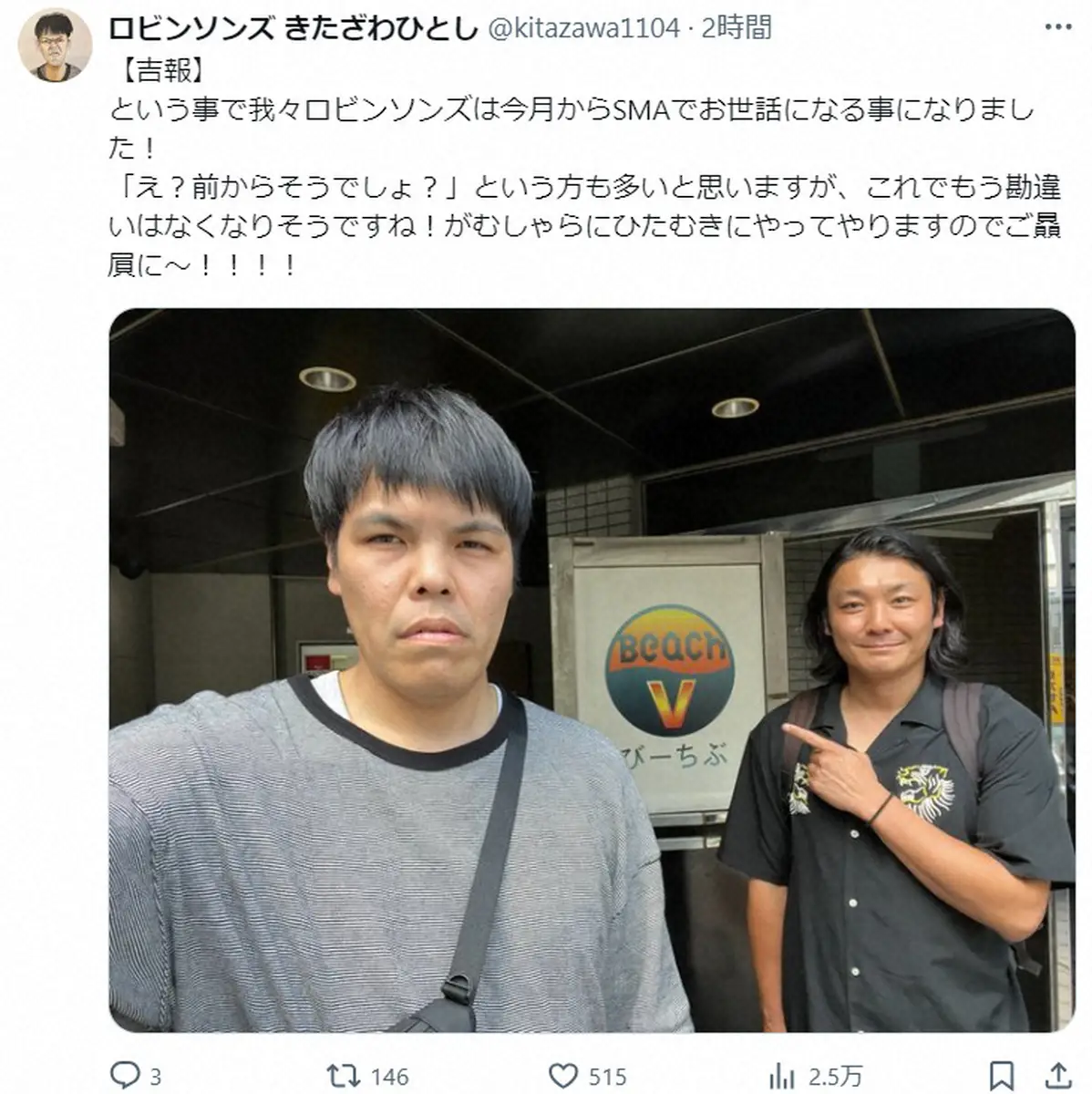 北澤は「【吉報】という事で我々ロビンソンズは今月からSMAでお世話になる事になりました!」と投稿。