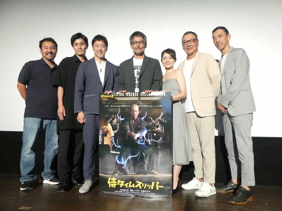 幕末から現代の時代劇撮影所にタイムスリップした会津藩士の奮闘を描いた時代劇コメディー。自主制作のため最小限のスタッフで撮影された作品ながらも、初日から客席は満員。山口は客席を見渡しながら、「たくさんの拍手をもらえて言葉に出来ません。感無量です」と感謝。その後、共演の沙倉ゆうのが涙ながらに撮影時のエピソードを語ると、つられてもらい涙を流した。