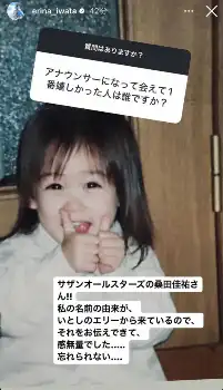 ストーリーズで質問を募集した岩田アナ。「アナウンサーになって会えて1番嬉しかった人は誰ですか?」という質問に対して「サザンオールスターズの桑田佳祐さん!!」と明かした。