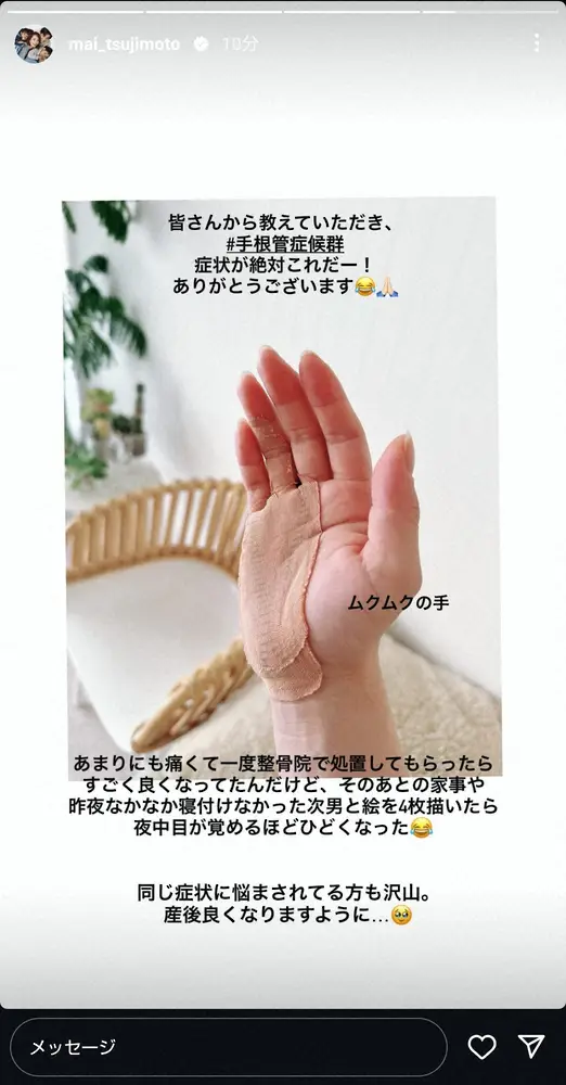 辻元舞公式インスタグラム(@mai_tsujimoto)から 今月第3子出産予定の辻元舞「夜中目が覚めるほど」手根管症候群による手の… ギャラリーで見る この記事のフォト 2024年08月19日の画像一覧 もっと見る 2024年08月19日の画像をもっと見る