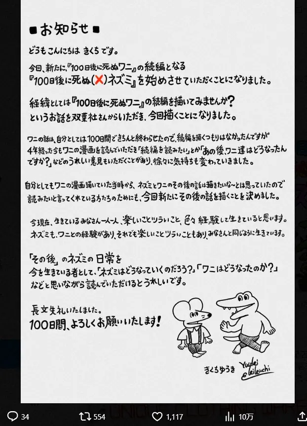 きくちゆうき氏のX(@yuukikikuchi)から 「100日後に死ぬワニ」作者、続編を発表 出版社の提案で「100日後に死ぬ… ギャラリーで見る この記事のフォト 2024年08月20日の画像一覧 もっと見る 2024年08月20日の画像をもっと見る