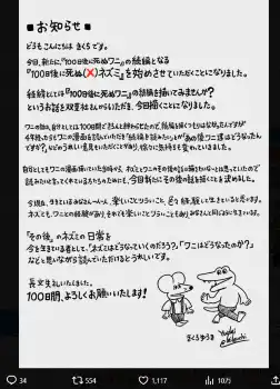 「自分としてもワニの漫画描いていた当時から、ネズミとワニのその後の後は描きたいな~とは思っていたのたので 読みたいと言ってくれている方たちのためにも、今回新たにその後の話を描くことを決めました」と決断に至った経緯を明かし「今現在、生きているみなさん一人一人、楽しいことツラいこと、色々経験して生きていると思います。ネズミも、ワニとの経験があり、それでも楽しいことツラいこともあり、みなさんと同じように生きています。“その後”のネズミの日常を今を生きている者として、“ネズにはどうなっていくのだろう”“ワニはどうなったのか?”などと思いながら読んでいただけるとうれしいです。長文失礼いたしました。100日間、よろしくお願いいたします!」と呼びかけた。