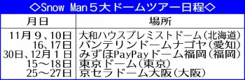Snow Manが初の5大ドームツアーを開催する。11月9日の北海道・大和ハウスプレミストドーム(札幌ドーム)公演を皮切りに、12月27日の京セラドーム大阪公演まで計13公演。グループ最大規模となる61万5000人を動員する。