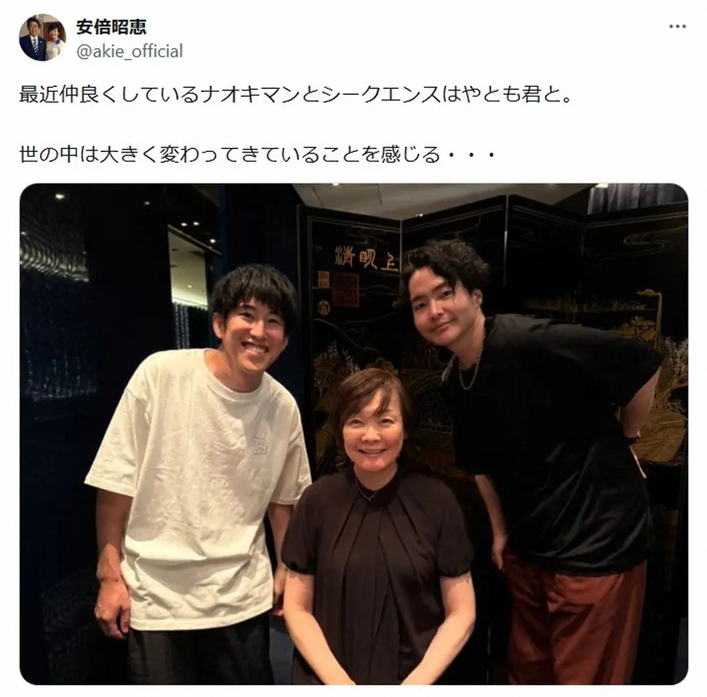 安倍昭恵さん 「最近仲良くしている」ユーチューバー&お笑い芸人と3ショット「意外な組み合わせ」の声