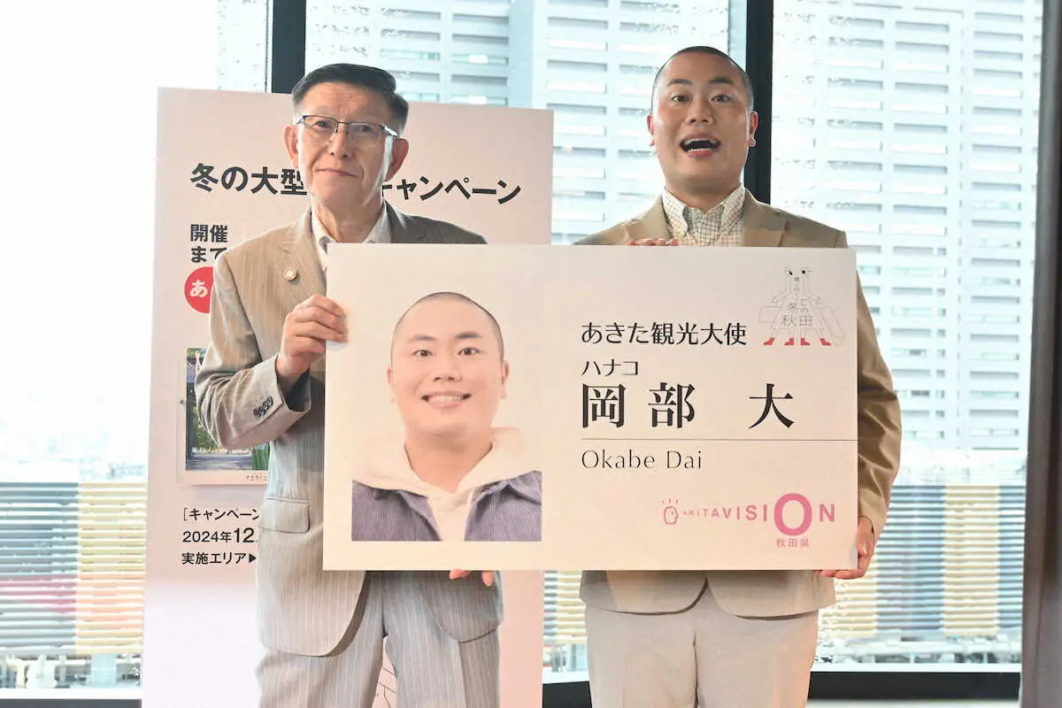 お笑いトリオ「ハナコ」の岡部大(35)が23日、都内で「秋田県冬の大型観光キャンペーン100日前イベント」に出席した。秋田県出身で、あきた観光大使に任命され「30歳を過ぎたあたりから秋田のために何かしたいという思いが年々強くなっていたので、本当にうれしい」と感激した。