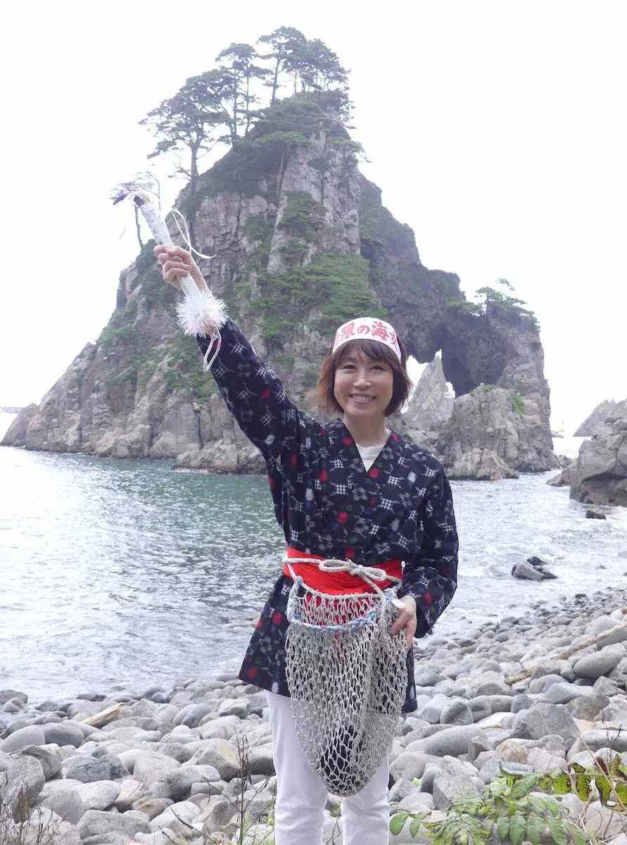 ご当地ソングの女王として知られる演歌歌手の水森かおり(50)が25日、岩手県久慈市の小袖海岸で新曲「三陸挽歌」のPRイベントを行った。
