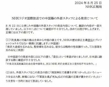 NHK広報局は25日、19日に同局が放送したラジオ国際放送などの中国語ニュースで発した不適切発言について、新たなお知らせを発表。靖国神社を巡る報道の中で、原稿にはない「『軍国主義』『死ね』などの抗議の言葉が書かれていた」との文言を一方的に付け加えていたと公表した。