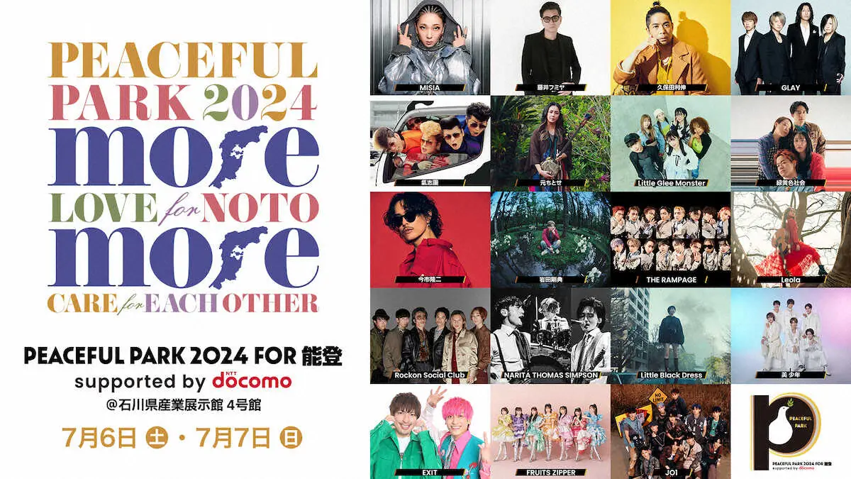 MISIA、藤井フミヤ、久保田利伸、GLAY、氣志團など総勢20組以上のアーティストが出演したた能登半島地震復興支援ライブ「PEACEFUL PARK 2024 for 能登 -supported by NTT docomo-」の模様が、9月1日から1カ月限定で配信されることが決まった。
