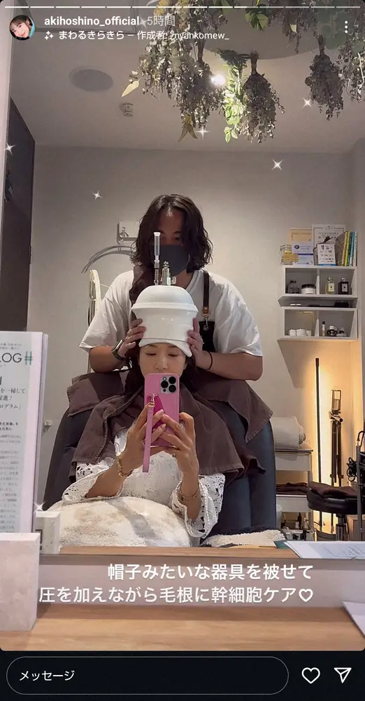 続けて施術を受ける様子を鏡越しの自撮り写真で掲載し、「帽子みたいな器具を被せて圧を加えながら毛根に幹細胞ケア」と投稿。終了後は「わたし浮腫が取れて帰り帽子がブカブカになりました」と伝えた。