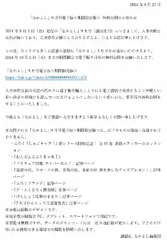 編集部はこの日、「入手困難な状況が続いている」として「ご迷惑をお掛けしておりますこと、心よりお詫び申し上げます」とお詫びを掲載。この状況を鑑みて、「この度、ひとりでも多くの読者の皆様に『なかよし』9月号をお読みいただけるよう、2024年10月2日(水)までの期間限定で電子版9月号の無料公開を実施いたします」と異例の本誌無料公開の実施を発表した。
