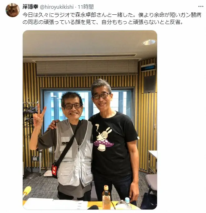 続けて「僕より余命が短いガン闘病の同志の頑張っている顔を見て、自分ももっと頑張らないとと反省」と、森永氏の姿に勇気づけられたと思いをつづった。