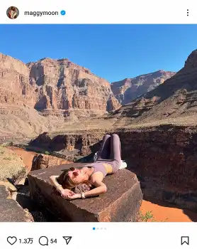 マギーは「Grand Canyon ヘリコプターツアー」とコメント。「期待以上の景色とパワフルさ!たくさんエナジーチャージできました」と、巨大な岩の上で仰向けで寝転んだ姿などを披露した。