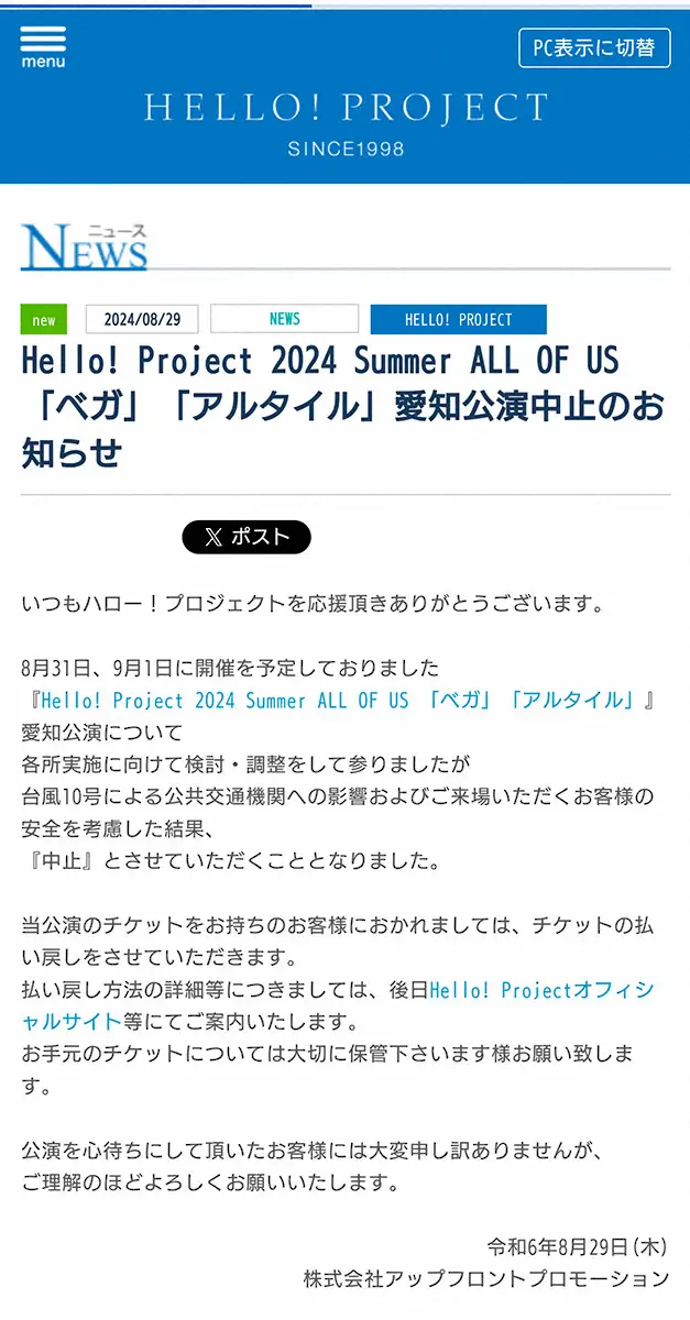 ハロー!プロジェクトは29日、名古屋市で31日と9月1日に予定していた「Hello! Project 2024 Summer ALL OF US」の「ベガ」「アルタイル」愛知公演を中止すると発表した。