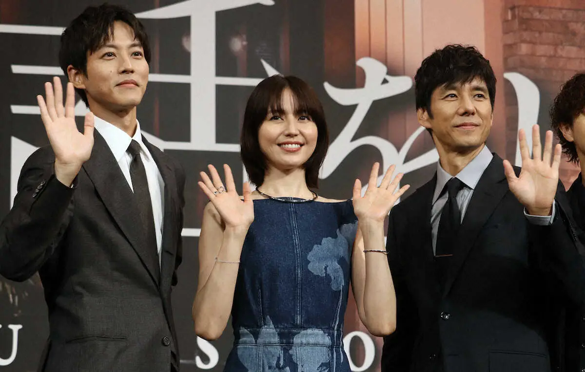 映画「スオミの話をしよう」の完成報告会を行った(左から)松坂桃李、長澤まさみ、西島秀俊
