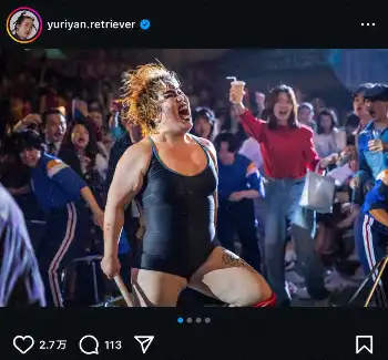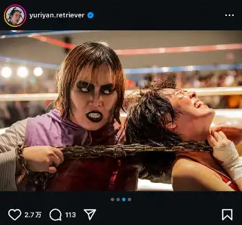 ゆりやんは主人公のダンプ松本役を演じている。この日、自身のインスタグラムで「極悪場面の写真公開!!!」と自身が演じたダンプ松本の写真を投稿した。