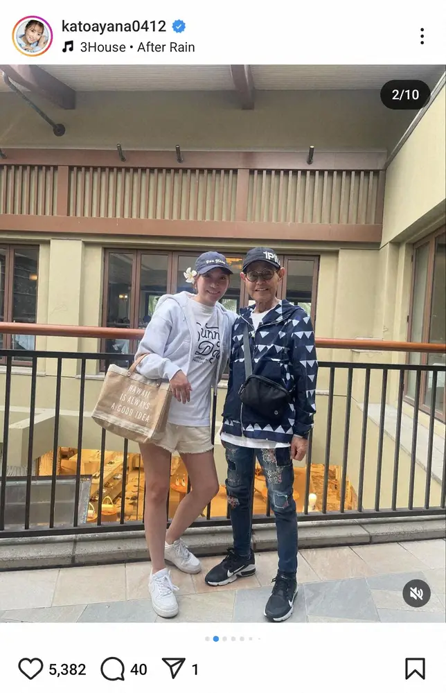 タレントの加藤綾菜(36)が2日、自身のインスタグラムを更新。夫でザ・ドリフターズの加藤茶(81)とハワイに出かけた際の思い出ショットを披露した。