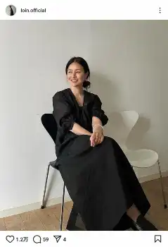 「試作中のワンピースに袖を通す。髪をブローしてきたのに括ってしまう」と、ラフなまとめ髪で黒いワンピースを着た姿を披露した。