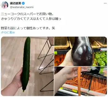 直美は「ニューヨークのスーパーでお買い物。きゅうりデカくてナスは太くて人参は細っ」とそれぞれの実物写真を添えて驚きを投稿。