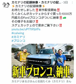 それから3カ月、ようやく到着したと待ちに待った知らせが。「カミナリ」の公式YouTubeチャンネルで石田は「国内にブロンコ走っている訳ですよ。それは2021年や2022年モデル。ただ、俺が購入したのって2023年モデルのブロンコなんですね。それって、まだ国内で走っていないんです。実例がないから、国土交通省の試験が必要だったということで」と、国土交通省の検査に通る必要もあったと報告。