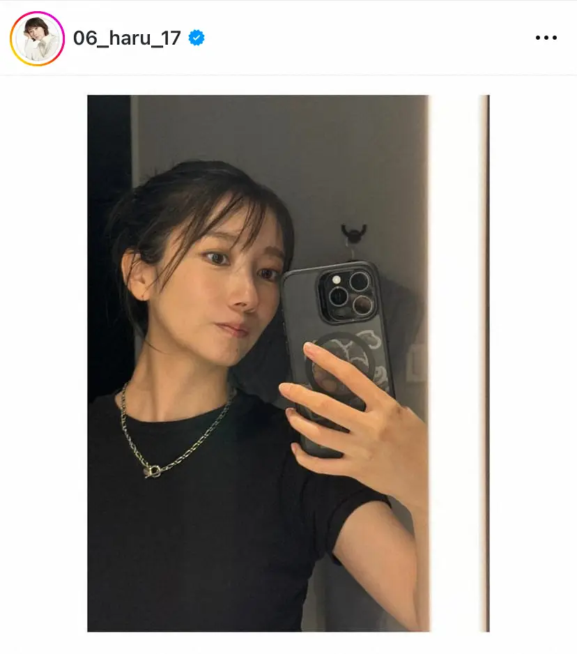 波瑠は「泊まりのお仕事だと真っ黒になりがちです」と書き出し、鏡越しの自撮りと、黒でまとめたファッションを公開。