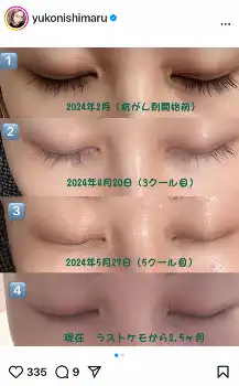 「子宮体がん」を公表した女優の西丸優子(44)が6日までに自身のインスタグラムを更新。抗がん剤治療から2カ月半経ち、まつ毛の状態を報告した。