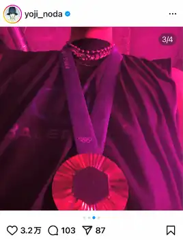 野田の首には金メダルも。「ものすごい力もらった。俺も頑張る。僭越ながら東京に続いて2度目、首からかけさせてもらったけどメダル、ズシンと、重い」とつづった。