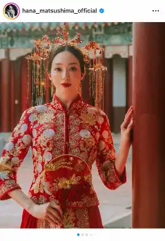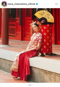 松島は「#ウェディングフォト」と真っ赤なドレスに身を包んだショットを披露。「和装に続いて…夫の母が台湾出身なので、3月に祖父のお墓参りで台湾へ行った際に、台湾バージョンの前撮りもしちゃいました」と経緯を記した。