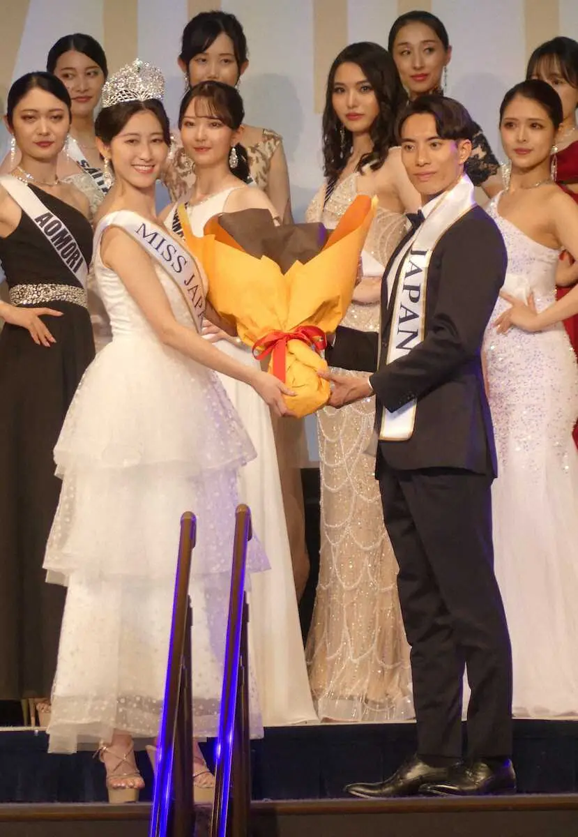 「2024ミス・ジャパン日本大会」でグランプリに選ばれた都島涼香さんと「ミスター・ジャパン」の池田和樹