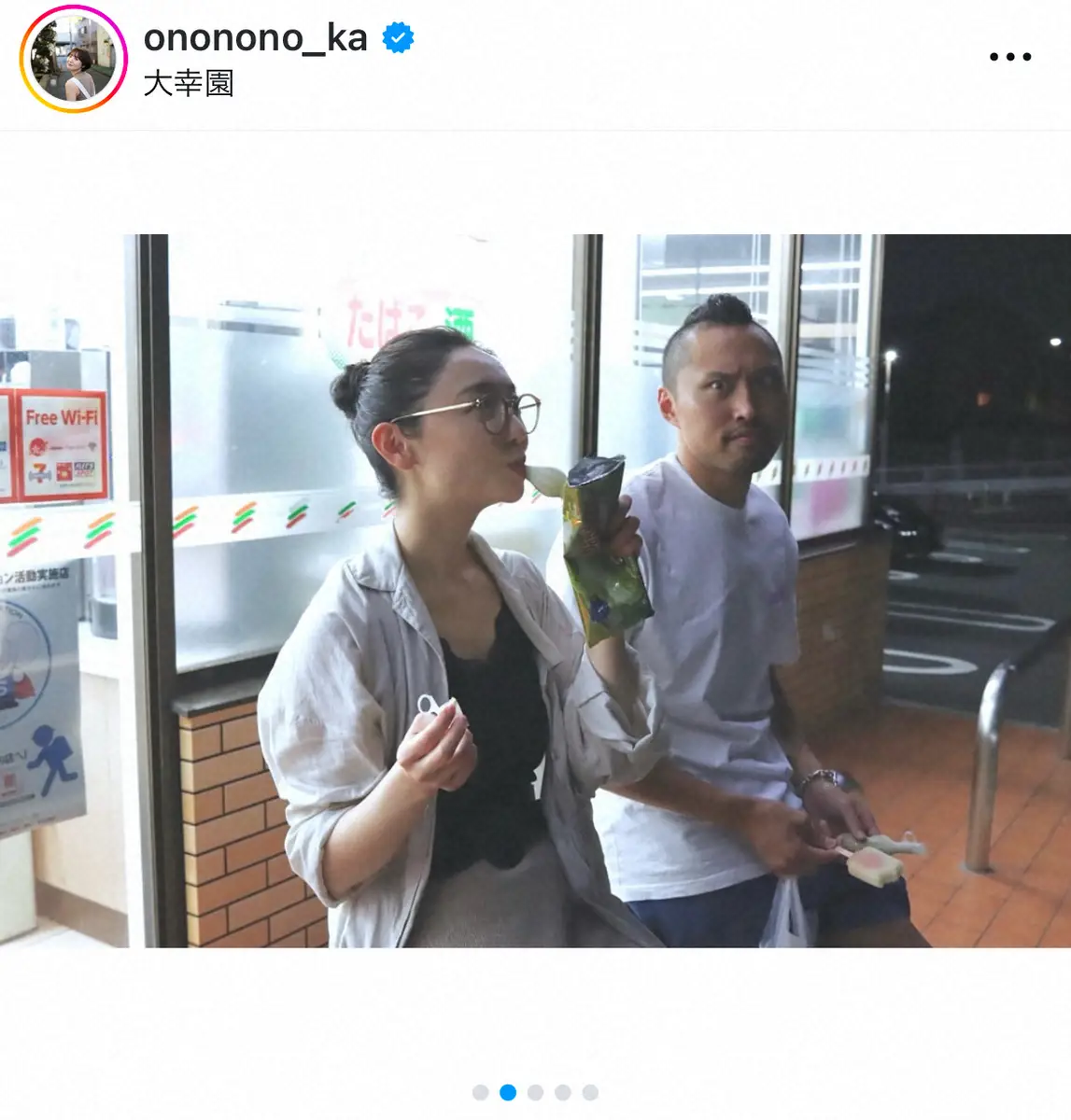 おのは「5年前の今日、ここで出会って 4年前の今日、家族になった!」とつづり、セブンイレブンの前で腰かける写真をアップ。水泳選手の夫・塩浦慎理と出会った日に同じ場所で撮影した2ショットを公開し「とゆことで結婚4周年です」と伝えた。