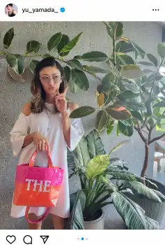 そして「バッグはブランド5周年限定カラーの@the_weekend_hotel !!」と差し色にピンクとオレンジのハンドバッグを合わせたファッションで腕を組んだ笑顔のショットや、おちゃめな表情をのぞかせた。