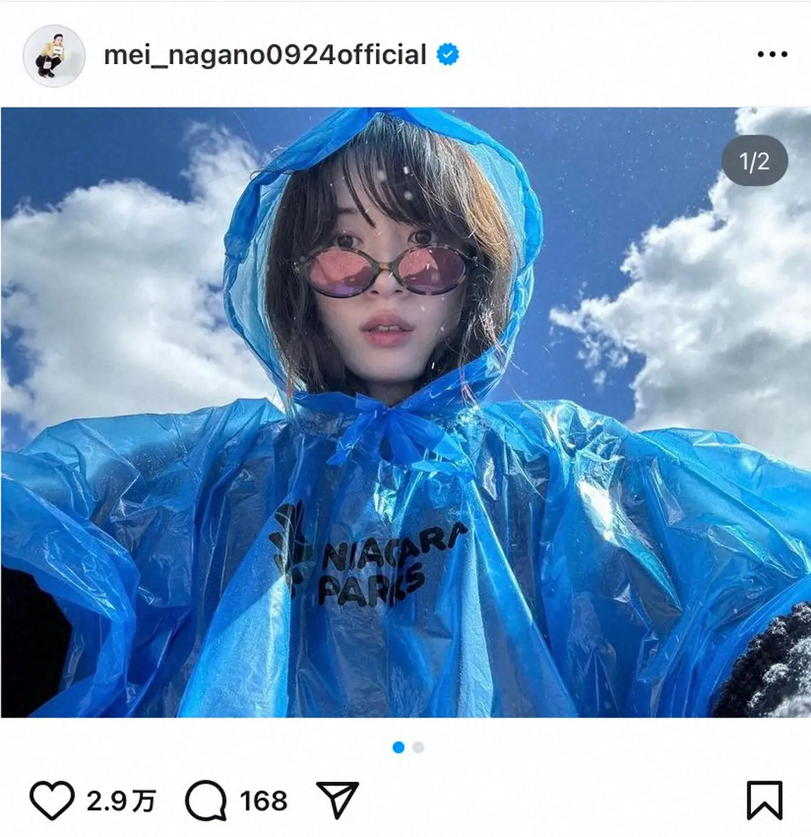 「ナイアガラの滝」と書き出した永野。ポンチョのような青いレインコート姿の写真とともに、迫力のある滝の映像も投稿した。