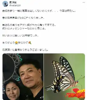 「最近私の周りをアゲハ蝶がやたら舞って来てる。何かのメッセンジャーなのかと感じる。思い返せば楽しい26年間でした。ありがとう 安らかに 応援頂いた皆様ありがとうございました」と記し、在りし日の篠原さんとの2ショットを公開した。