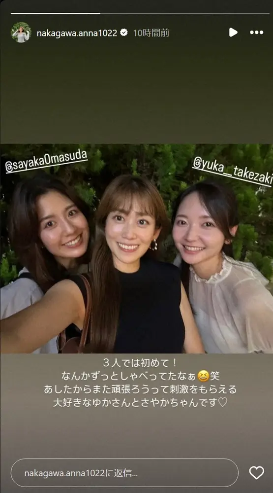 ストーリーに「3人では初めて!」と書き出すと、黒のノースリーブトップスの自身と白のブラウス姿の桝田アナ、白のトップス姿の竹崎アナの3ショットをアップ。